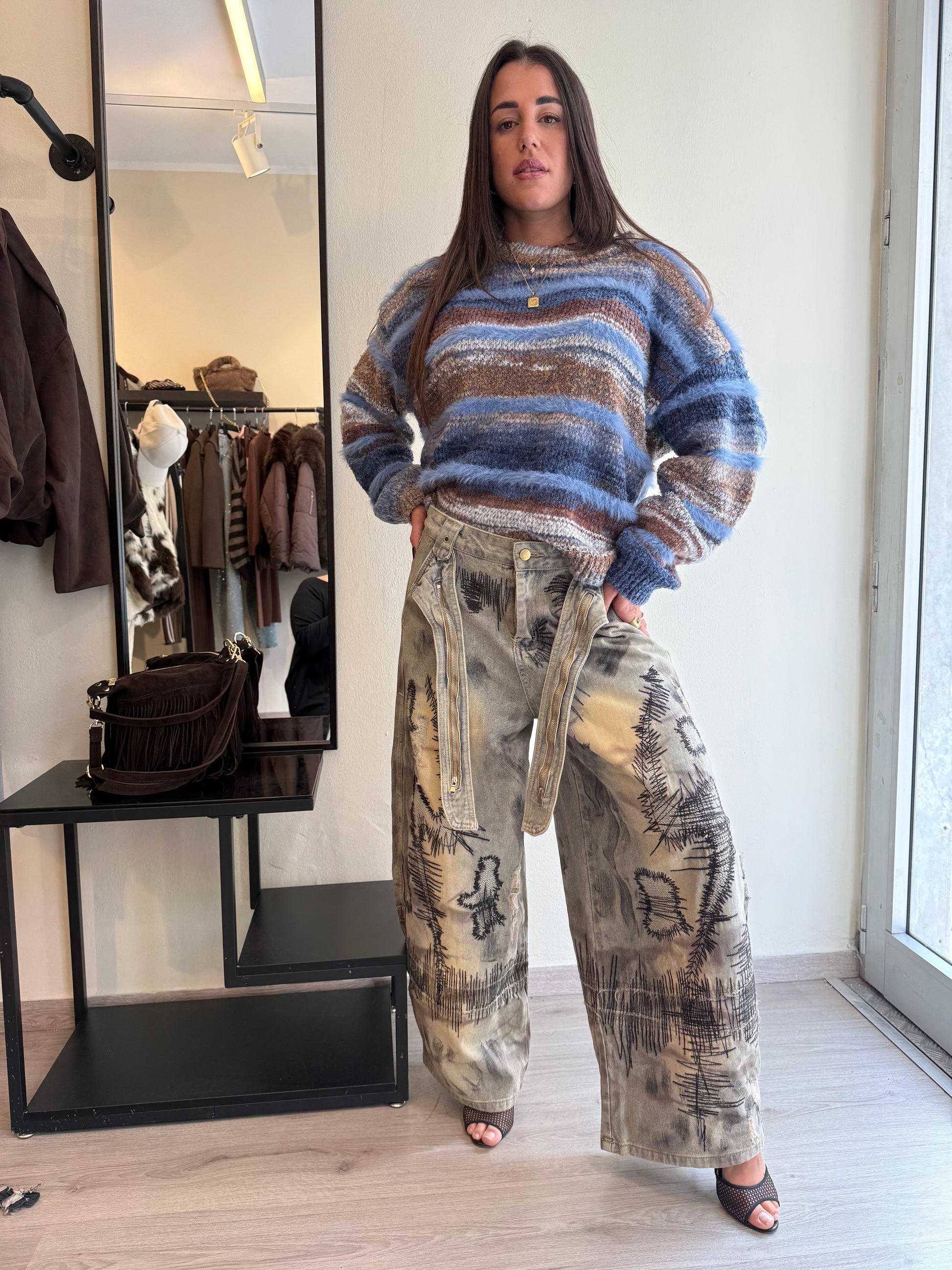 Maglia girocollo a righe sui toni del’azzurro e del marrone. Taglia unica. Vestibilità XS-XL
